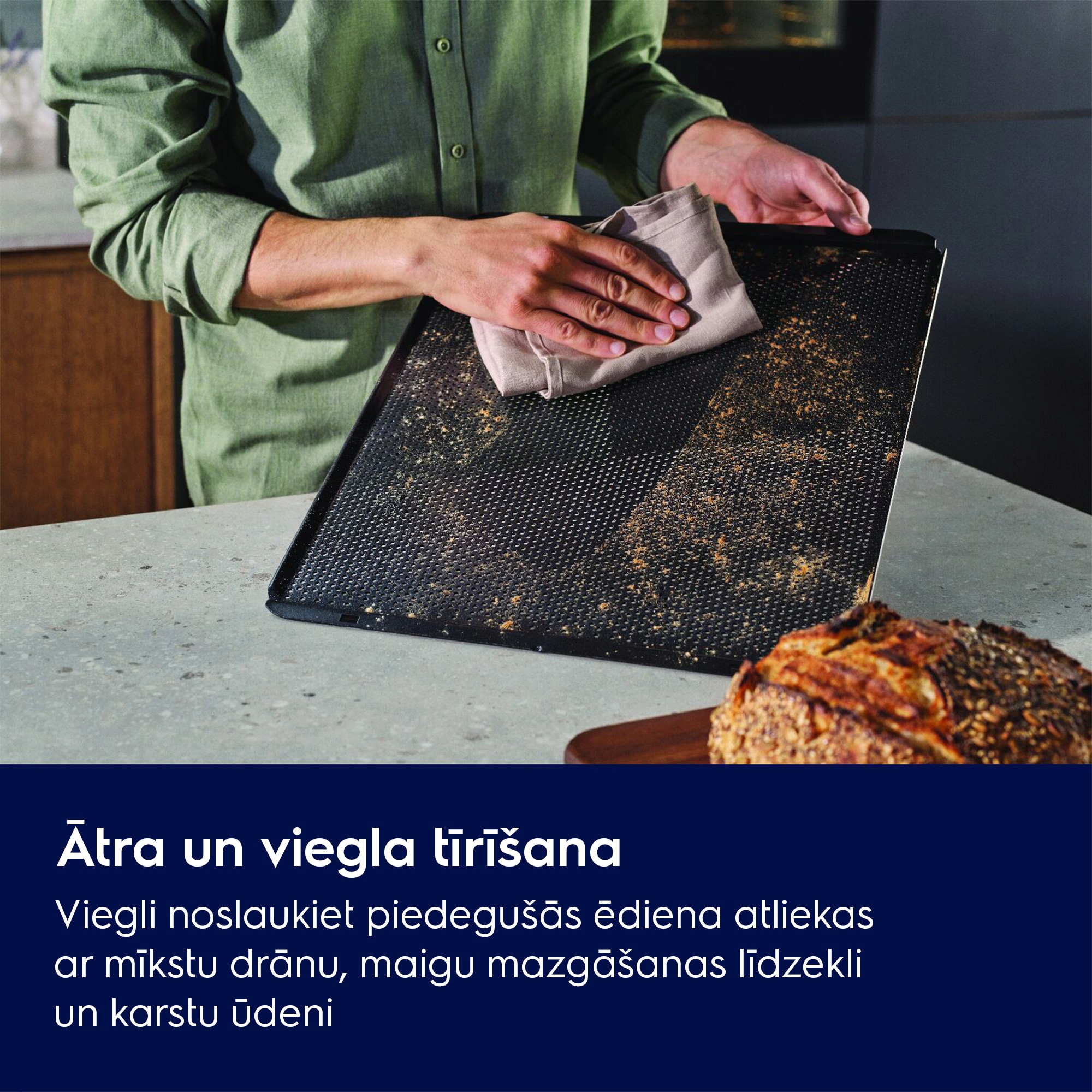 *Pamatojoties uz uzņēmumā veiktu testēšanu, salīdzinot "Easy2Clean" konditorejas izstrādājumu pannu ar tradicionālo kūku pannu bez atverēm.