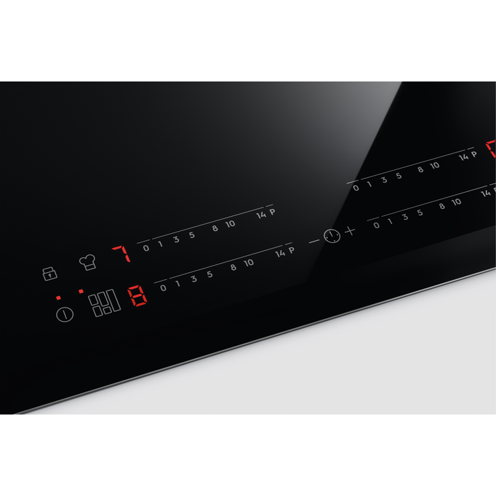 590x520 mm, 4 indukcijas zonas, Hoob2Hood, bez rāmja, ar noslīpētu priekšējo malu, slīdošā vadība katrai zonai, tieša piekļuve katram cepšanas līmenim, trauka atpazīšana, Eko taimeris, tilta, jaudas pastiprināšanas, pauzes un bērbu drošības funkcijas, Auto-Off