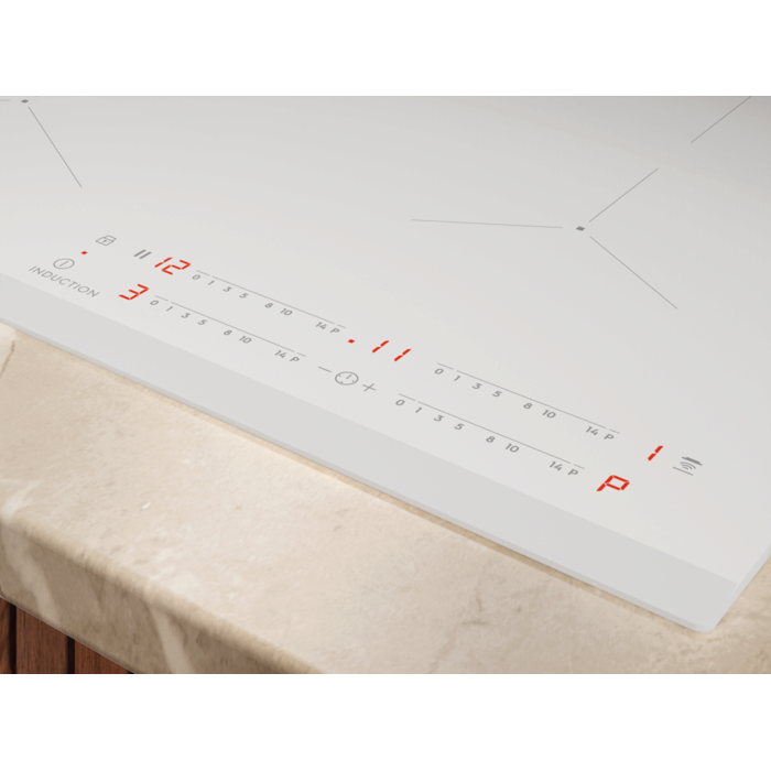 780x520 mm, balta, 4 indukcijas zonas, bez rāmja, ar 1 noslīpētu malu, slīdošā vadība katrai zonai, tieša piekļuve katram cepšanas līmenim, trauka atpazīšana, Eko taimeris, tilta, ātrās sakarsēšanas, pauzes un bērbu drošības funkcijas, Auto-Off