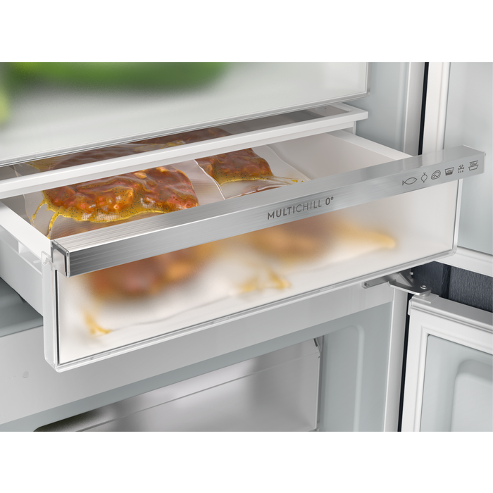 Pielāgojamā atvilktne “MultiChill 0°” paplašina ēdiena gatavošanas iespējas un ir optimizēta gaļas un zivju uzglabāšanai. Izmantojot lietotni, var aktivizēt tādas produktu programmas kā dzērienu atdzesēšana, droša saldētu produktu atkausēšana vai pagatavotu ēdienu uzglabāšana.