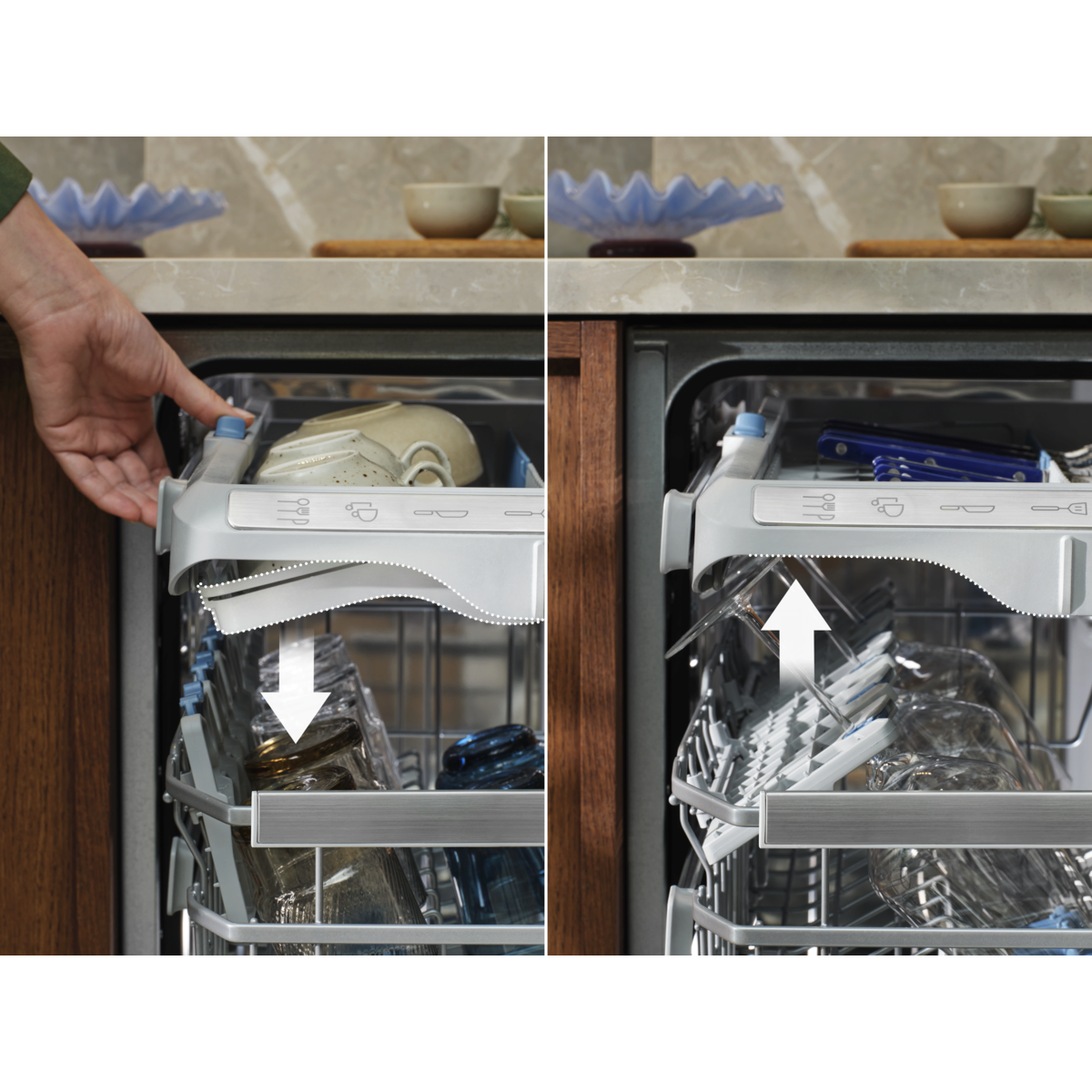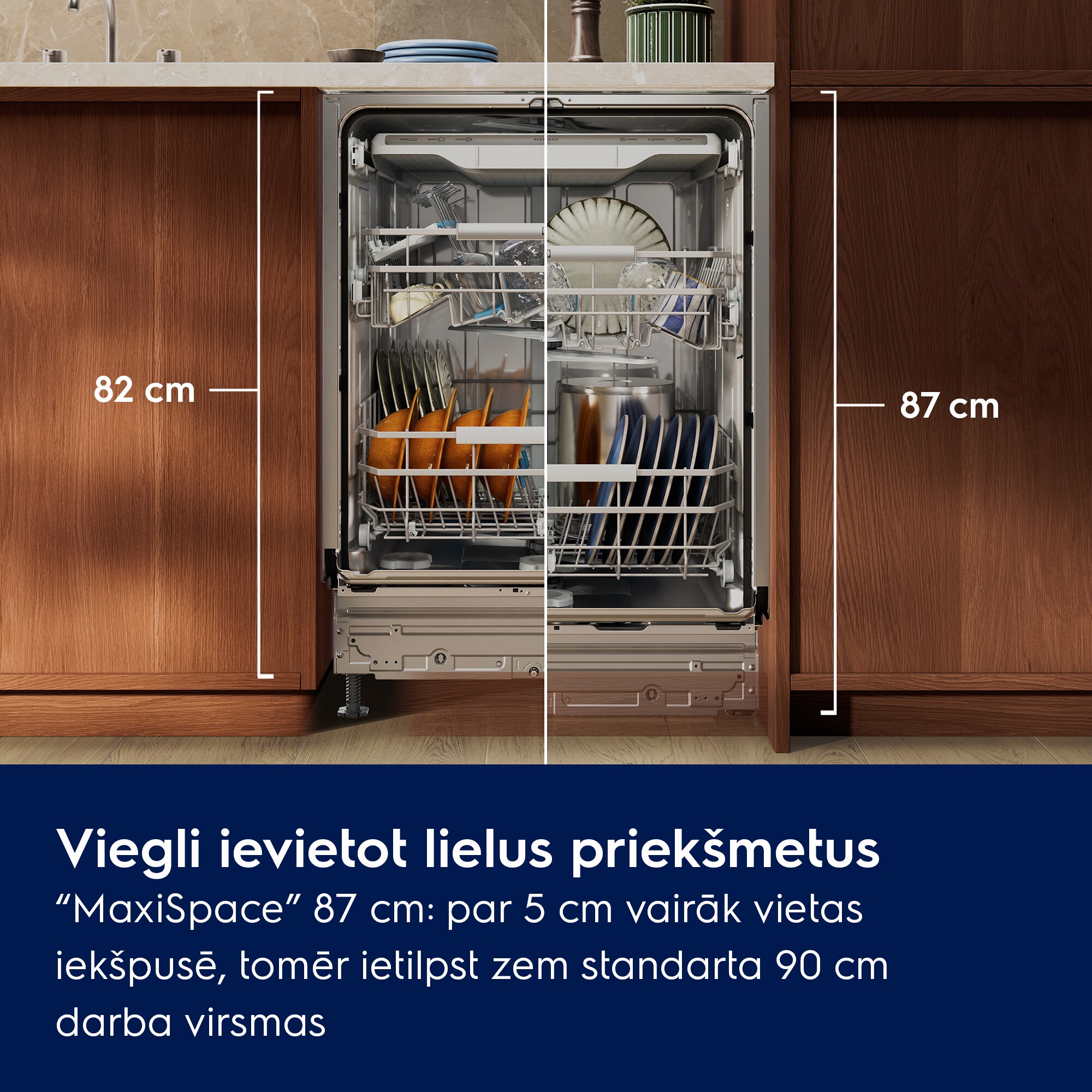 900. sērijas “MaxiSpace” ir par 5 cm augstāka iekšpuse, tomēr ietilpst zem standarta virtuves darba virsmas. Lielajos, daudzpusīgajos grozos viegli ievietot karafes, vīna glāzes un pat terīnes, bet galda piederumu plauktā – tasītes. Jaudīga tīrīšana noņem ēdiena atliekas ar minimālu ūdens patēriņu.