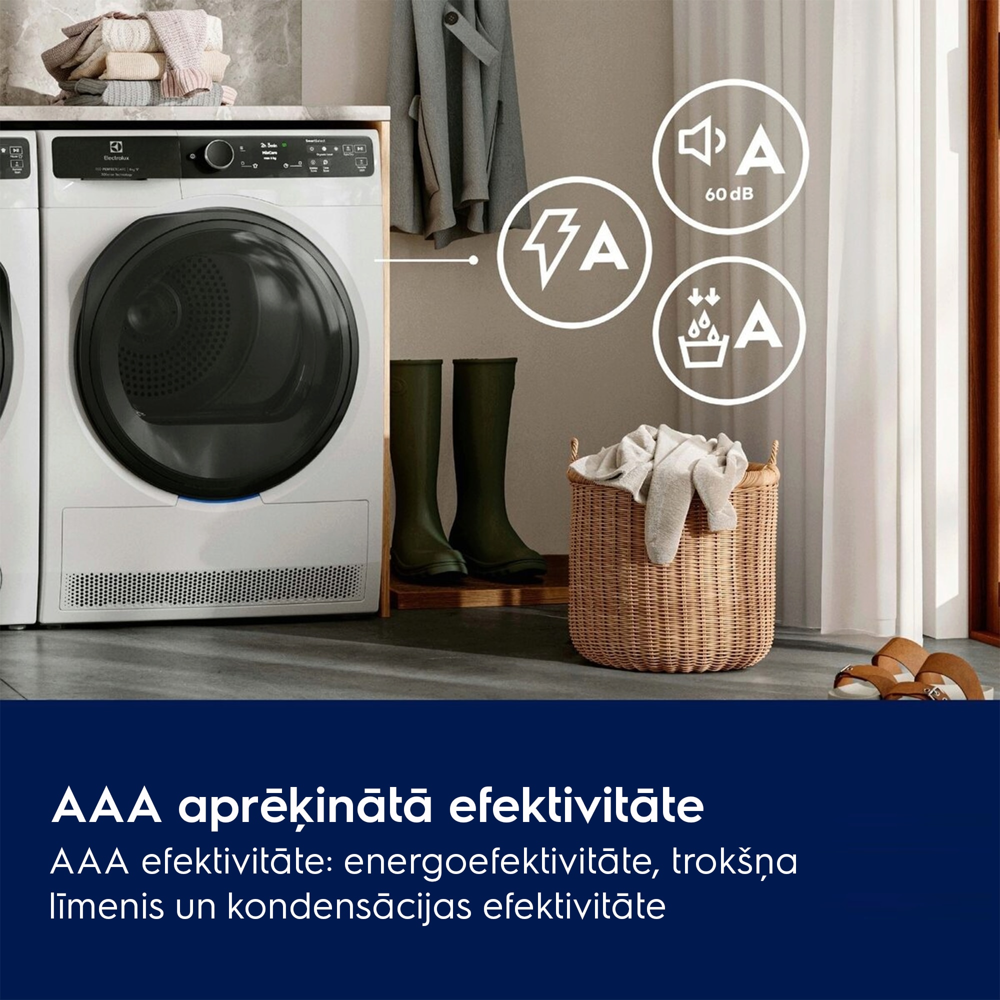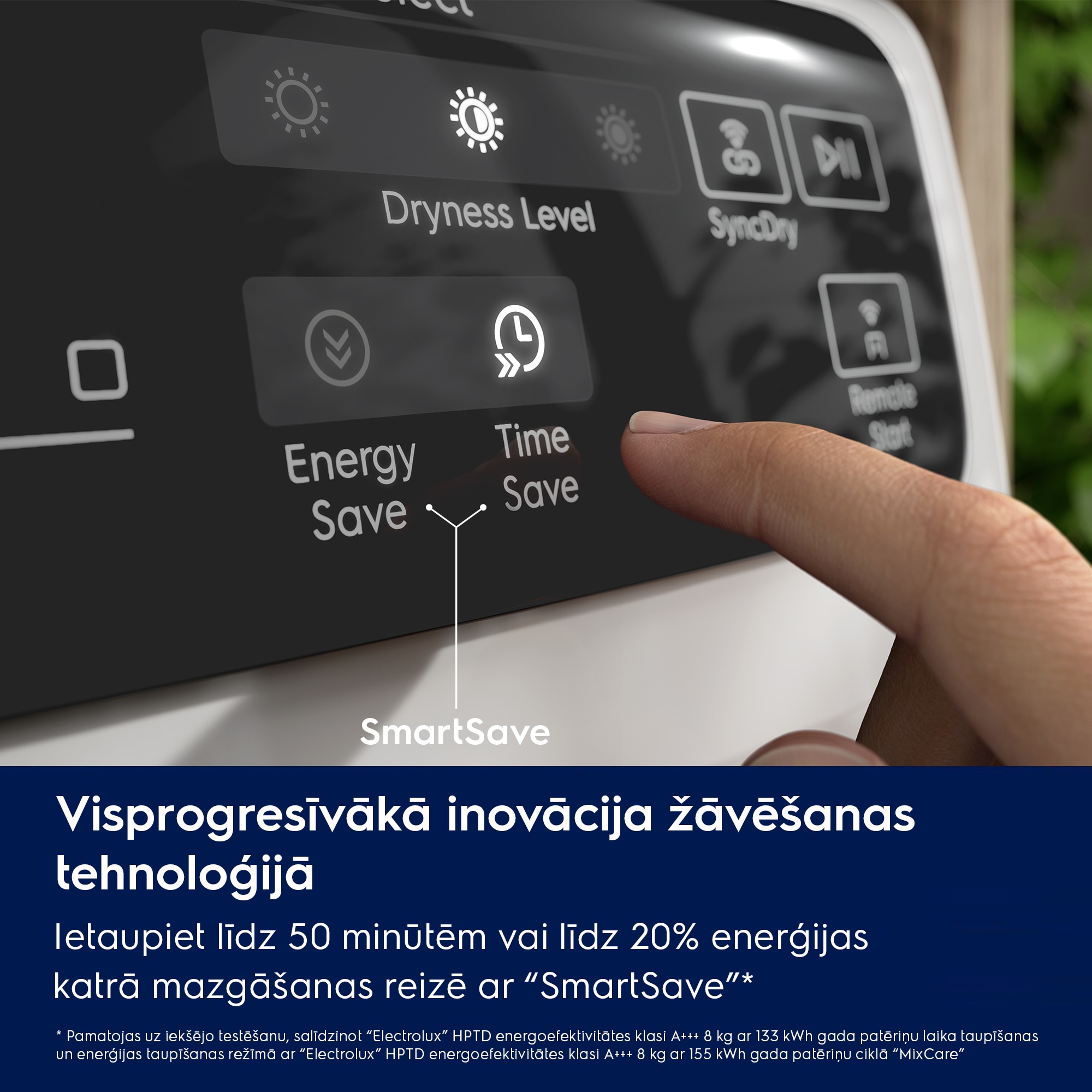 * Pamatojoties uz iekšējiem testiem, salīdzinot “Electrolux” HPTD energoefektivitātes klasi A+++ 8 kg ar 133 kWh gada patēriņu laika taupīšanas un enerģijas taupīšanas režīmā ar “Electrolux” HPTD energoefektivitātes klasi A+++ 8 kg ar 155 kWh gada patēriņu ciklā “MixCare”.