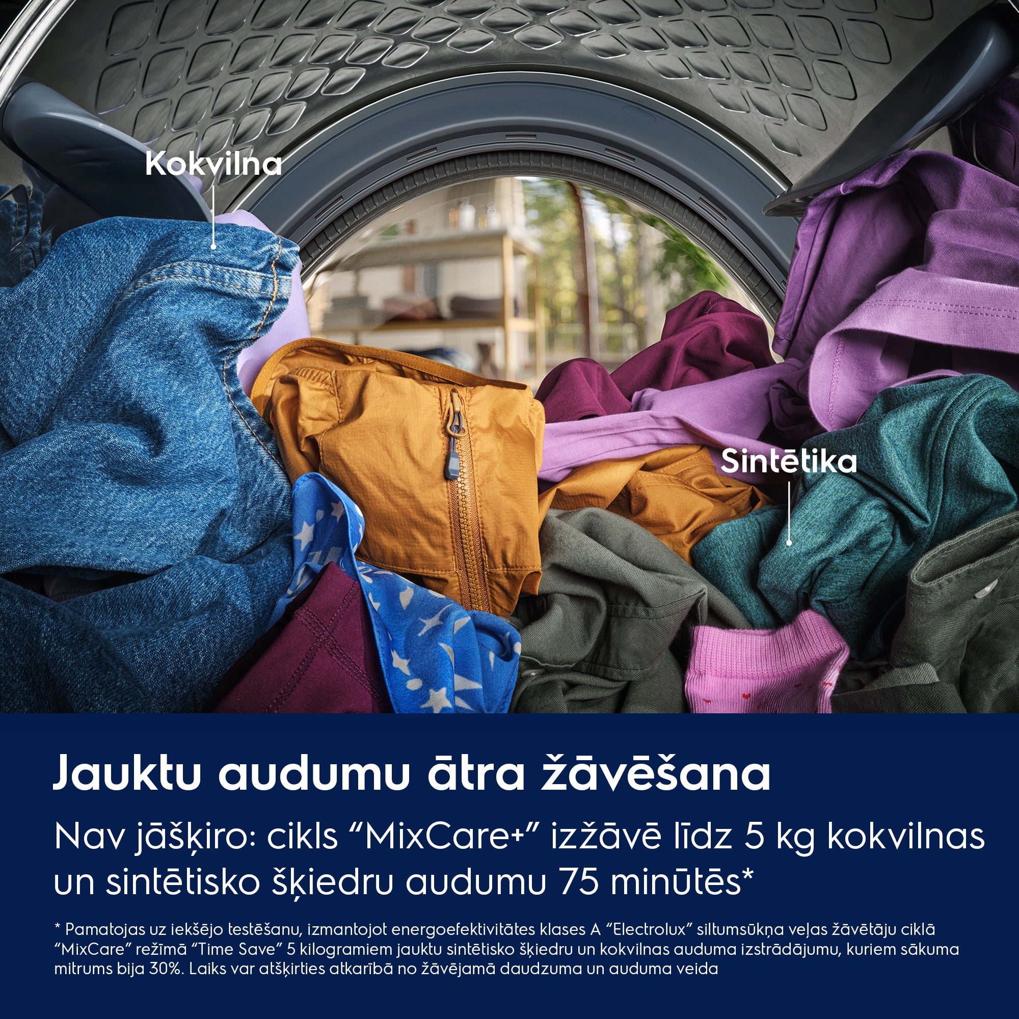 * Balstoties uz iekšējo testēšanu, izmantojot A energoefektivitātes klases “Electrolux” siltumsūkņa veļas žāvētāju ciklā “MixCare” režīmā “Time Save” 5 kilogramiem jauktu sintētisko un kokvilnas materiālu apģērbu, kuriem mitruma saturs bija 30%. Dažādiem daudzumiem un auduma veidiem laiks var atšķirties.