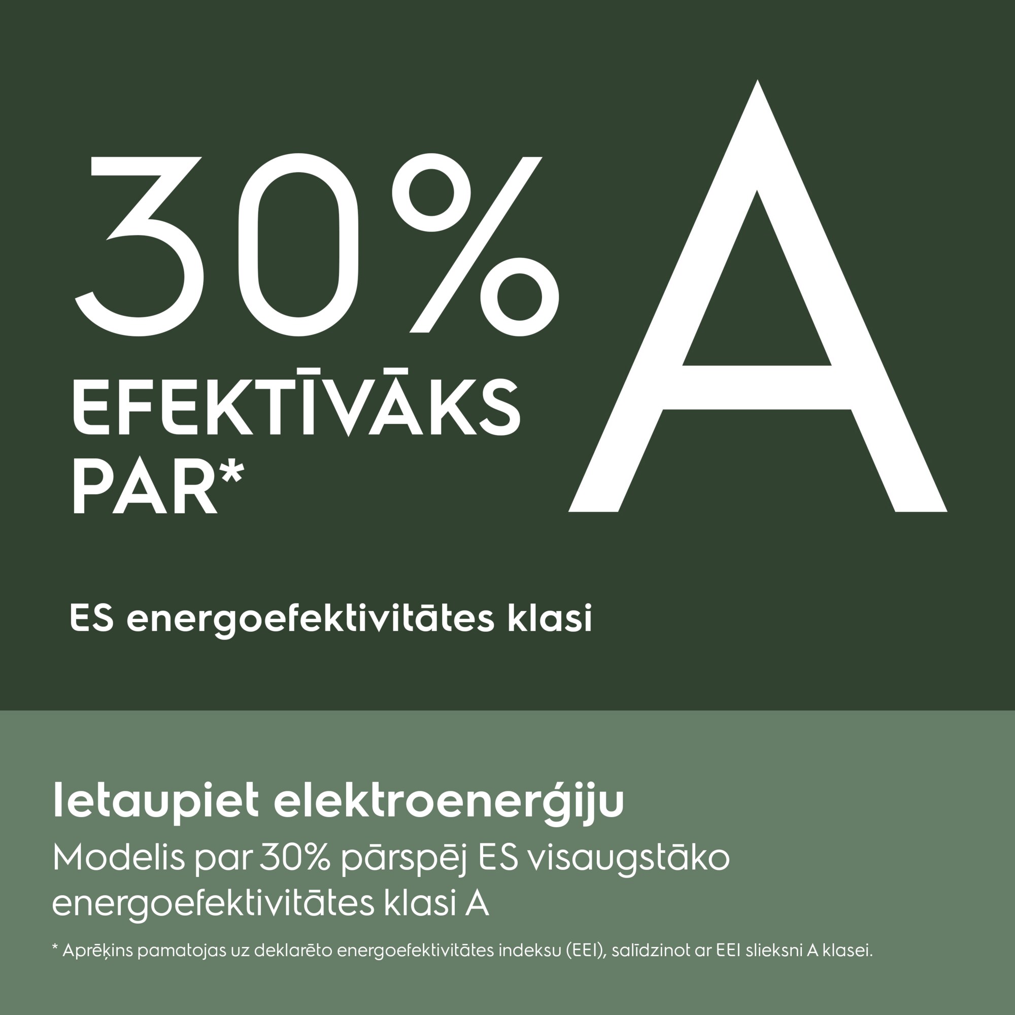 Šī Electrolux Ecoline veļas mašīna pārspēj augstāko enerģijas vērtējuma līmeni A, ietaupot 30% vairāk enerģijas.* Electolux EcoLine veļas mašīnas izvēlētas, pamatojoties uz visaugstāko enerģijas novērtējumu un funkcijām, resursu taupībai lietošanas laikā.