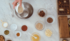 Ar dakšiņu sajauciet auzu pārslas, linsēklas un ķirbju sēklas, samaltās mandeles, sāli, cepamo pulveri un kanēli. Medu sajauciet ar ābolu biezeni un pievienojiet iepriekšējām sastāvdaļām. Pievienojiet avenes, lazdu riekstus un balto šokolādi un kārtīgi samaisiet.