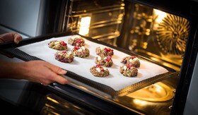 Ar rokām izveidojiet astoņas mazas bumbiņas. Saplaciniet tās uz cepamā papīra cepumu formā. Cepiet 10–15 minūtes 200 °C temperatūrā.