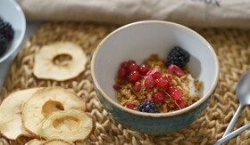Bļodā ielejiet mājās gatavotu jogurtu un tam pa virsu – granolu. Dekorējiet ar svaigiem augļiem.