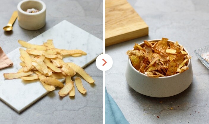 1Kartupeļu miziņu kraukšķiGatavojot kartupeļus, miziņas bieži vien tiek izmestas. Tā vietā apcepiet tās cepeškrāsnī ar nedaudz olīveļļas un šķipsniņu sāls. Pacienājiet viesus ar gardu, netradicionālu un kraukšķīgu uzkodu pirms vakariņām.