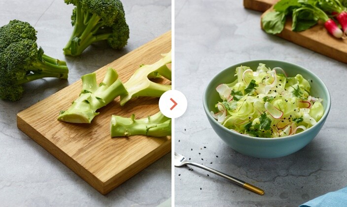 3Brokoļu kātiņu salātiSaglabājiet kātiņus! Brokoļu kātiņi nebūt nav ārā metami — tajos ir tikpat daudz uzturvielu kā ziedkopās. Smalki sagrieziet kātiņus ar asu dārzeņu mizotāju un samaisiet kopā ar iecienītākajām salātu sastāvdaļām.