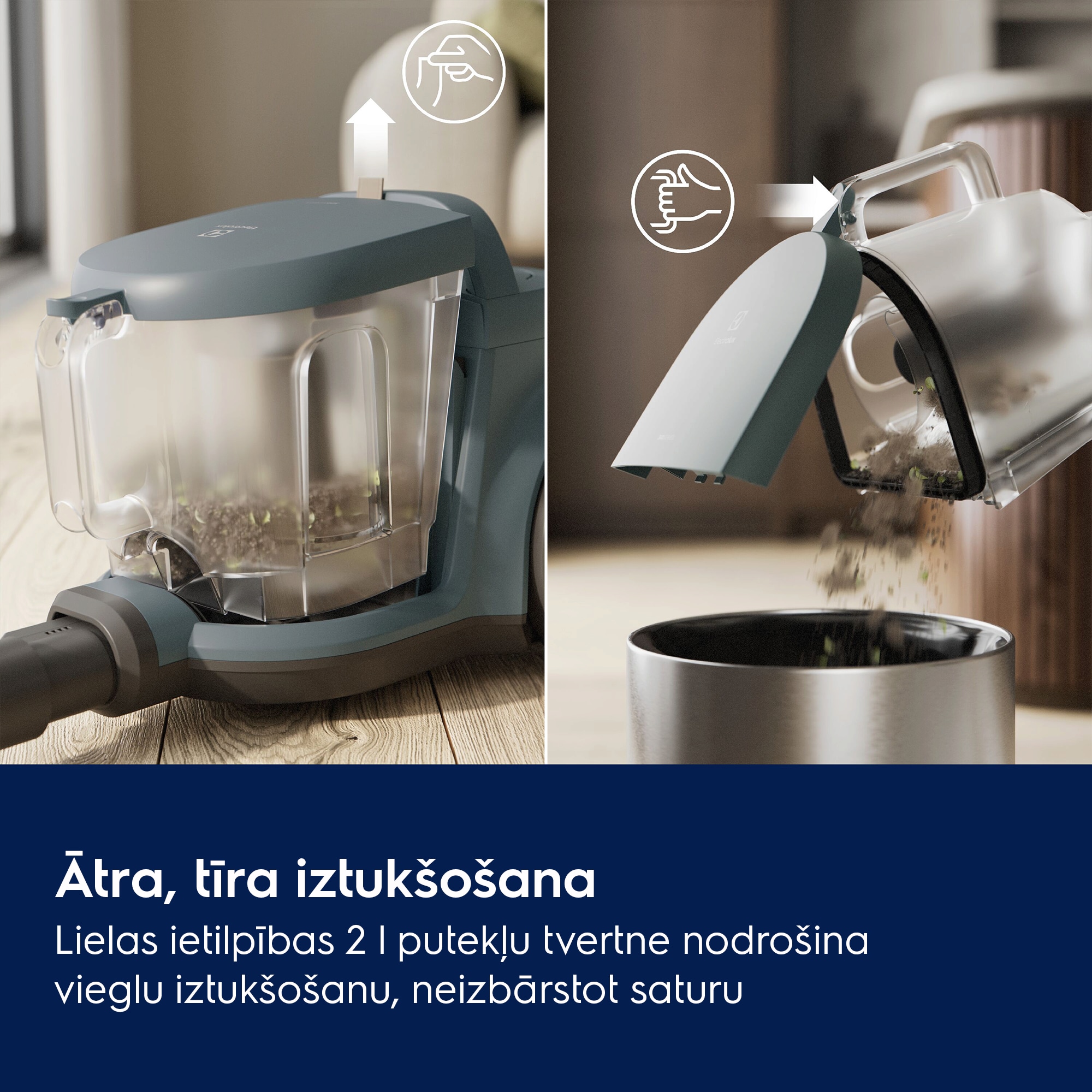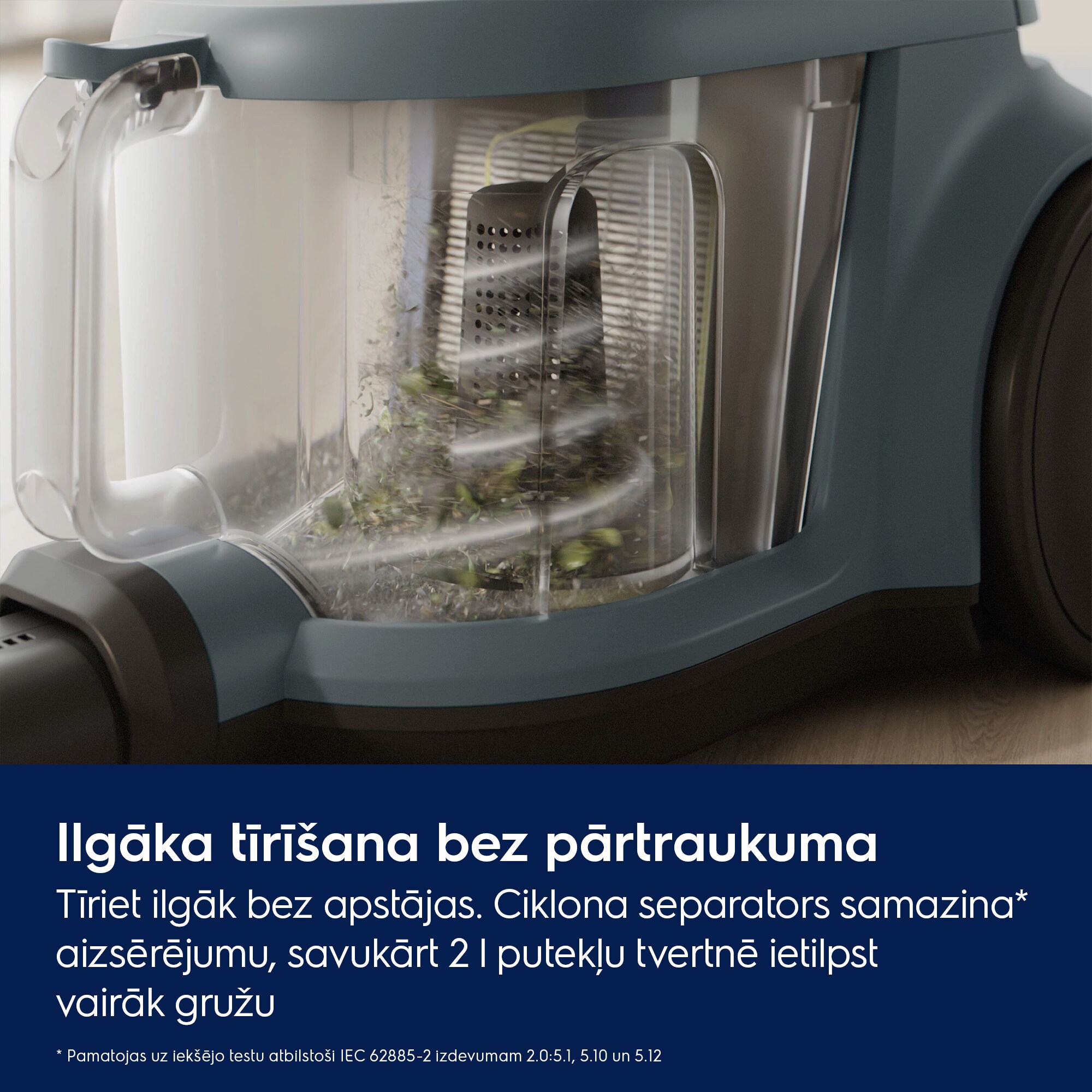 Izstrādāts ērtībām. Šim putekļsūcējam ir 2 l putekļu tvertne, kompakts dizains vieglai uzglabāšanai un ciklona atdalītājs darbībai bez nosprostošanās. Ar HEPA filtrāciju un „CombiFloor“ uzgali tas rūpīgi tīra dažādas virsmas.
