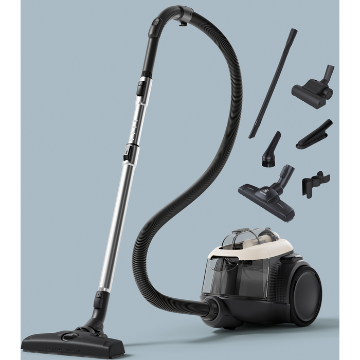 Bez putekļu maisiņa, 700W, 12m darb. rādiuss, telesk. caurule, mīksti riteņi, mazgājams Hepa Allergy Plus E13 filtrs, 74dB, 7.75kg