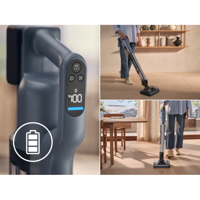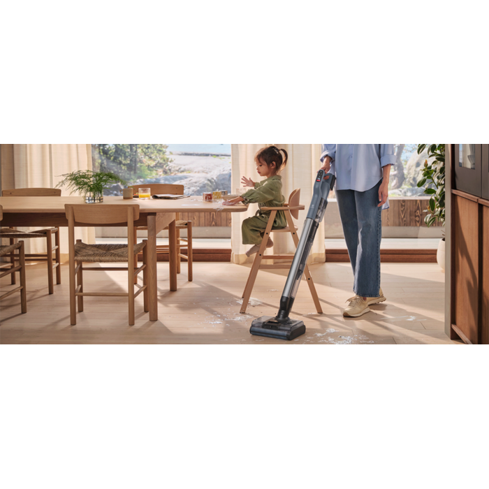 Pilnvērtīgs risinājums ērtai lietošanai bez kabeļa. Šis trīs vienā putekļsūcējs mazgā un sūc virsmas, kā arī viegli piekļūst grūti aizsniedzamām zonām, pateicoties tā elastīgajam dizainam. Noņemamā rokas ierīce atvieglo ātru uzkopšanu un mēbeļu sūkšanu.